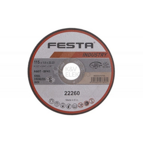 Profesionální řezný kotouč na kov, litinu, NEREZ, vyrobeno v EVROPĚ!, řada kotoučů FESTA INDUSTRY je, jak již z názvu vyplývá určena zejména pro profesionální použití, kvalita ověřená reálnými zkouškami zaměřenými na počet a rychlost řezů. Druh zrna - KORUND, pojivo - syntetické pryskyřice na bázi aldehydu, provedení - ROVNÝ, max. pracovní rychlost - 80 m/s, max. přípustné otáčky - 12200 ot/min, PRO ZVÝŠENÍ PEVNOSTI ARMOVÁNO DVOUVRSTVOU SKLOTEXTILNÍ VLOŽKOU! KOTOUČE FESTA INDUSTRY SPLNUJÍ EN 12413 a homologaci OSA!