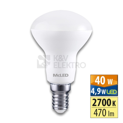 Kvalitní LED žárovka E14 McLED R50 4,9W od stejnojmenného výrobce vydává příjemné teplé bílé světlo. LED žárovka s výkonem 4,9W je ekvivalentem standardní 40W žárovky. Využívá patici E14 a nabízí průměrnou životnost 25 000 hodin. Specifikace LED žárovky E14 McLED R50 4,9W ML-317.004.87.0 LED žárovka E14 McLED R50 4,9W tvaru reflektoru svítí teplým bílým světlem o teplotě chromatičnosti 2700K, a tím pádem se vyznačuje zabarvením světla více do oranžova. Hodí se do relaxačních místností, do obýváku, ložnice apod. LED žárovka McLED disponuje úhlem vyzařování 120°. Třída energetické účinnosti byla stanovena na stupeň F. U světelných zdrojů došlo ke změně energetických štítků z nařízení EU. Energetická škála je nyní na stupnici A-G. Zmizely hodnoty A+ až A+++. Podrobnější informace se dozvíte v našem článku Kromě široké nabídky LED žárovek E14 McLED u nás můžete prohlédnout i ostatní LED žárovky E14 či velké množství LED žárovek, které nahradí 40W vláknové žárovky. Naleznete u nás také nejrůznější svítidla, např. kancelářská, dětská, koupelnová, kuchyňská či třeba nouzová, oblíbených značek. Rozměry LED žárovky jsou: 50mm průměr a 83mm délka. ##VIDEO:https://www.youtube.com/embed/B7IJuw_9YWg## Technické detaily LED žárovky E14 McLED R50 4,9W Reflektorová LED žárovka E14 McLED R50 4,9W vyzařuje teplé bílé světlo o teplotě chromatičnosti 2700K a světelném toku 470lm. Vyzařovací úhel činí 120°. Provedení v opálovém skle. Vždy se řiďte postupem od výrobce a montáž provádějte jen tehdy, jste-li k takovému úkonu oprávněni. V opačném případě přenechte instalaci na odborníkovi s příslušným certifikátem. Certifikáty výrobku LED žárovka E14 McLED R50 4W (40W) teplá bílá (2700K), reflektor 120° ML-317.004.87.0 splňuje příslušné normy ČSN. O společnosti McLED Začátek české společnosti McLED sahá do roku 2011, kdy ve firmě Schmachtl CZ spol. s.r.o. vznikl nápad na rozšíření sortimentu elektrotechnických a strojírenských výrobků pod vlastní značkou LED osvětlení. Společně s narůstající poptávkou po spolehlivém LED osvětlení byl tento nápad doveden do konce založením McLED v roce 2015. Nyní má již společnost centrálu ve Vestci u Prahy, vlastní široké skladové prostory a vývojové laboratoře. U nás si z výroby společnosti McLED můžete pořídit například LED pásky, trubice, žárovky a vnitřní i venkovní svítidla.