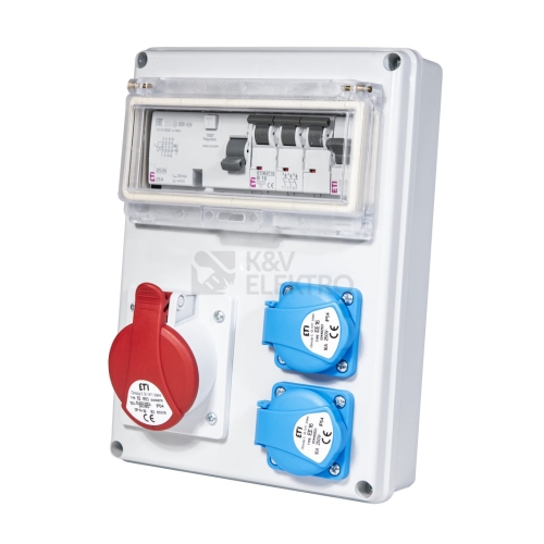 Zásuvková nástěnná skříň - kombinace ETI jištěná s chráničem Zásuvky: 2x230V/16A (s ochranným kolíkem dle ČSN), 1x400V/16A/5pól, jištěno: 1x ETIMAT COLOUR 1p B16 10kA, 1x ETIMAT COLOUR 3p B16 10kA, EFI-P4 AC 25/0,03 10kA, IP 54, IK10, Plast – ABS, PC (polykarbonát) okno, včetně vývodky PG21 Další kombinace na poptání u našich obchodníků a techniků