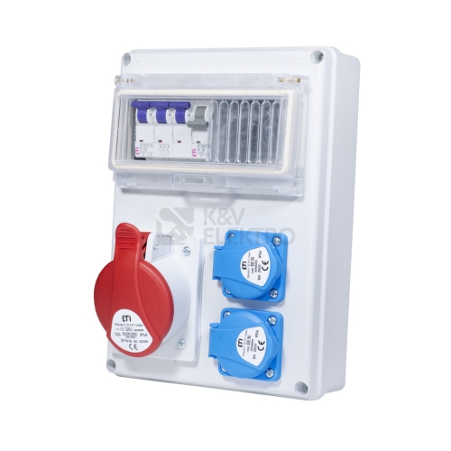 Zásuvková nástěnná kombinace - skříň ETI Zásuvky: 2x230V/16A (s ochranným kolíkem dle ČSN), 1x400V/32A/5pól, jištěno: 1x ETIMAT COLOUR 1p B16 10kA, 1x ETIMAT COLOUR 3p B32 10kA, IP 54, IK10, Plast – ABS, PC (polykarbonát) okno, včetně vývodky PG21 Další kombinace na poptání u našich obchodníků a techniků