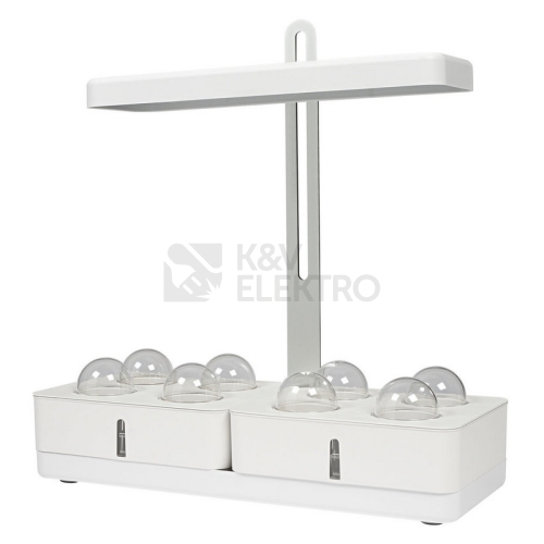 LED růstová svítidla se dvěma kultivačními boxy. Vlastnosti produktu: Používá kombinaci bílých LED diod s plným spektrem a červených LED diod. Výška zdroje je nastavitelná podle výšky rostliny. Výhody produktu: Speciálně vyvinuté LED spektrum podporuje fotosyntézu ve většině rostlin. Napodobuje denní / noční cyklus automatickým časovačem. Druh použití: Zahradnictví ve vnitřních prostorách. Kuchyně. Obytné prostory. Výbava / příslušenství: Včetně kultivačních boxů s indikací hladiny vody.