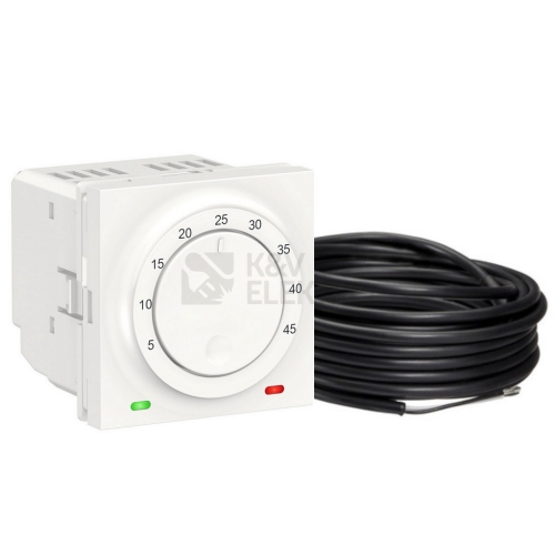 Schneider Electric Nová Unica podlahový termostat NU350318 v bílé barvě s podlahovým čidlem typu NTC 10kΩ snímač s kabelem délky 4m Připojovací svorky tohoto podlahového termostatu jsou šroubové. Způsob upevnění je nacvaknutí. Kromě toho je na povrchu označení L+N, OUT, senzor. Má šířku 45 mm, výšku 45 mm, hloubku 47 mm a hloubku zapuštění 33 mm, Její odpovídající montážní krabice může být zapuštěna do povrchu stěny s montáží pod omítku. Podlahový termostat je vyroben z PC (polykarbonátu) GF10 FR, kovu, termoplastu stabilizovaného ABS-UV, takže je co nejodolnější. Kromě toho dosahuje úrovně ochrany IK01, která může pomoci chránit před nárazy. Dosahuje také stupně ochrany IP20. Také je šetrné k životnímu prostředí, přičemž je odolné vůči UV záření, acetonu, alkoholu, čpavku, bělidlu, tekutému mýdlu, oleji, benzínu, kapalině na čištění oken. Pro regulaci teploty je jmenovité provozní napětí 230 V. Navíc splňuje normu směrnice EMC, EN 607320-2-9, směrnice NN. Kromě toho neobsahuje halogeny, což je prospěšné pro vaše zdraví. A typ ovládání tohoto podlahového termostatu je elektronický regulátor. Teplota zobrazovaná na podlahovém termostatu je velice přesná, s přesností měření 0,5 °C.