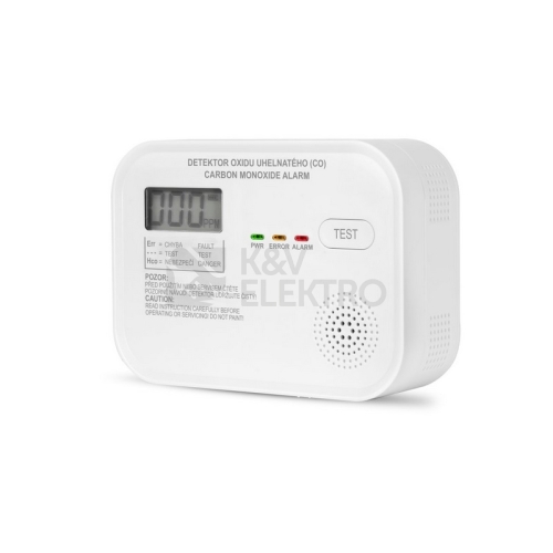 Detektor oxidu uhelnatého LM-218A: Displej poskytuje informace o koncentraci CO, stav baterie a upozorňuje i na nízkou koncentraci CO (30 PPM) během 40 minut. Tlačítko TEST/ MENU slouží k otestování funkčnosti, ztlumení a resetu naměřených hodnot. Tento autonomní detektor CO je certifikovaný podle nové normy EN 50291-1:2018 a je vhodný pro použití v obytných prostorách. Je napájen 3 tužkovými bateriemi, které jsou součástí balení. Stupeň krytí IP40. Výhody LM-218A: bateriové napájení český popis včetně návodu multifunkční LCD displej s informacemi o úrovni koncentrace CO detekce elektrochemickým čidlem vhodné i pro vlhké prostředí při relativní vlhkosti 0–90% (např. koupelny) akustická signalizace > 85 dB ve vzdálenosti 1 m signalizace i nízké koncentrace CO (25PPM) multifunkční tlačítko na test akustického signálu, ztlumení signálu a resetu 10 letá životnost s ohlášením konce životnosti na LCD snadná a rychlá instalace Technické parametry Napájení 4,5V, 3x1,5V alkalické baterie Životnost baterie 3 roky Zjišťovaný plyn oxid uhelnatý Detekční metoda elektrochemický článek Hlasitost 85 dB Příkon 0,003 mA (pracovní <65mA) Indikace slabé baterie 3,5V Stupeň krytí IP40 Životnost 7 let Pracovní teplota -10 °C až 45 °C Rozměry (DxŠxH) 107x77x36mm