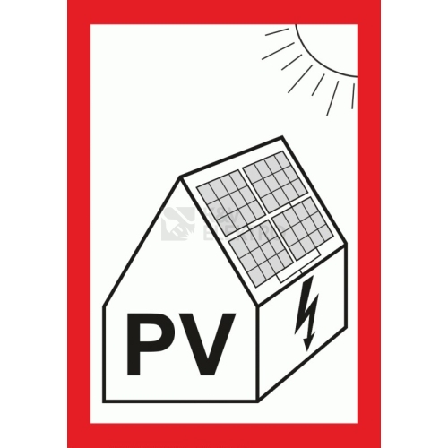 Označení, upozorňující na výskyt fotovoltaické instalace na budově podle ČSN 33 2000-7-712 . Umístění: na počátku elektrické instalace v místě elektrické energie, je-li vzdáleno od počátku elektrické instalace na spotřebitelském zařízení nebo rozvaděči ke kterému je připojeno napájení od měniče