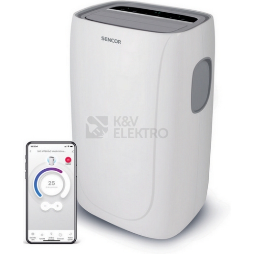 Mobilní klimatizace Sencor se 3 režimy provozu, dotykovým ovládacím panelem a příkonem chlazení 1200 W Charakteristika: Chladící výkon 9 000 BTU/h 3 režimy provozu (Chlazení / Odvlhčování / Ventilace) 4 úrovně nastavení rychlosti (Nízká / Střední / Vysoká / Automatická) Teplota nastavitelná v rozsahu 18-32 °C Objem proudícího vzduchu: 290 m3/h Doporučená plocha místnosti: 31-35 m2 Doporučená velikost místnosti: 80-91 m3 (Přepočteno na podmínky Střední Evropy) Výkon odvlhčování: (28 l/den) Ovládací panel s LED displejem zobrazuje: teplotu / režim / režim SLEEP (spánek) / rychlost ventilátoru / časovač Dálkové ovládání s LCD displejem: 24hodinový časovač automatického zapnutí / vypnutí s kroky po 60 minutách Ovládání přes Wi-Fi s aplikací Sencor HOME Noční režim „Spánku" pro úsporu energie a klidnější chod během noci Funkce automatického nastavení posledního navoleného režimu při opětovném spuštění Možnost automatického pohybu vertikálních lamel Integrovaný zásobník na kondenzát (o objemu 0.4 l) s výpustí a indikací naplnění Funkce samoodpařování kondenzátu – za běžných podmínek odpadá nutnost vylévat kondenzát / Místnost není vysušována Funkce ochrany kompresoru proti zamrznutí 0,205 kg ekologického chladiva R290 Kompletní sada pro odvod teplého vzduchu a těsnění oken 4 pojezdová kolečka a integrovaná rukojeť pro snazší manipulaci