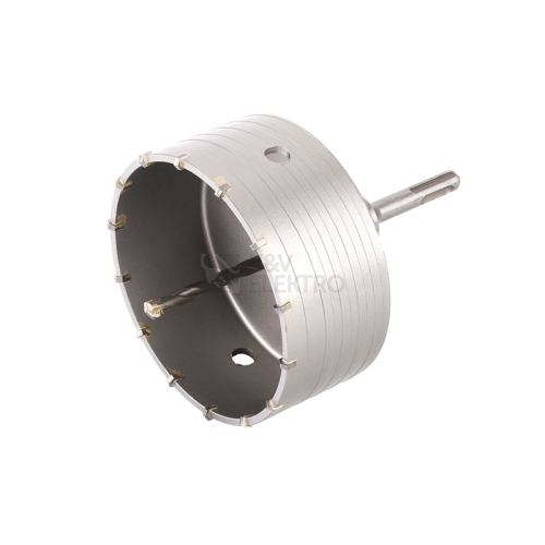 vykružovací / vrtací korunka s SK plátky a vodícím vrtákem uchycení SDS+ kvalitní SK plátky (SK - slinutý karbid), dlouhá životnost, rychlý prostup materiálem vodící - středící vrták usnadňuje práci a korunku přesně vede a drží na požadovaném místě pro vrtání větších průměrů do betonu, porobetonu, cihel a podobných zdících materiálů korunka není vhodná na vrtání železobetonu