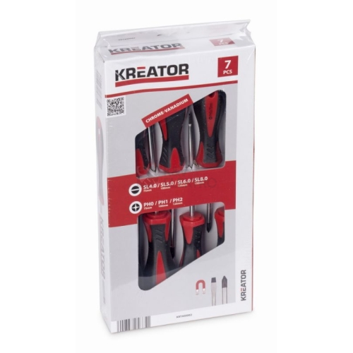 Plochý:4.0 (75 mm)5.0 (100mm)6.0 (125 mm)7.0 (150 mm)Philips:PH0 (75 mm)PH1 (100mm)PH2 (125 mm)Magnetický černý hrot