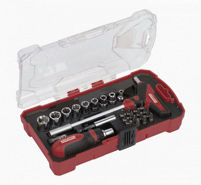 Ráčnový set hlavic a bitů 28ks.9ks nástrčných klíčů 1/4 16 různých bitů (4x hex , 4x plochý, 4x Philips(R) a 4x Torx(R))1x rukojeť T1x šroubovací držák1x držák bitů