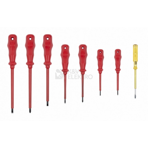 Základní sada izolovaných šroubováků. Tato sada obsahuje 8 šroubováků vyrobených z materiálu Cr-V. Obsah balení: 1x SL3 - 75 mm 1x PH2 - 150 mm 1x SL4 - 100 mm 1x PH1 - 100 mm 1x SL5 - 125 mm 1x PH0 - 75 mm 1x SL6 - 150 mm 1x zkoušečka 100 - 500 V