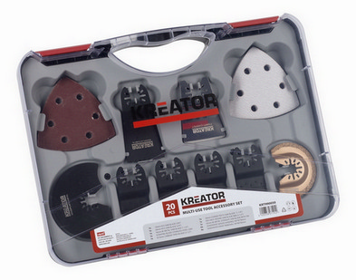 1x HCS řezný nůž 10mm (3/8") 1x HCS řezný nůž 20mm (3/4") 1x BI-metal řezný nůž 34mm (1-1/4") 1x seškrabovací nůž z nerez oceli 1x kotouč s karbidovým povlakem 63,5mm 1x řezný nůž s hrubými zuby 34mm (1-1/4") 1x HSS řezný nůž prům.88mm (3-1/2") 1x BI-metal řezný nůž rovný 45mm 6x brusný papír na dřevo/ocel 6x brusný papír na barvu