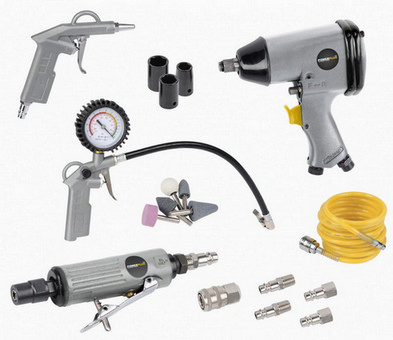 1 ks rázový utahovák Max. utahovací moment: 310 NmOtáčky: 7.000/min1 ks přímé brusky, 6 mm upínáníOtáčky: 25.000/min.