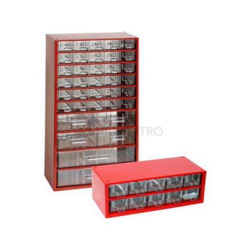 Set se skládá ze dvou skříněk 6765 + 6737:materiál: kov, plastbarva: červená Set kovových ukládacích skříněk s plastovými zásuvkami 1 velikosti je vhodný pro přehledné skladování drobných předmětů a součástek.