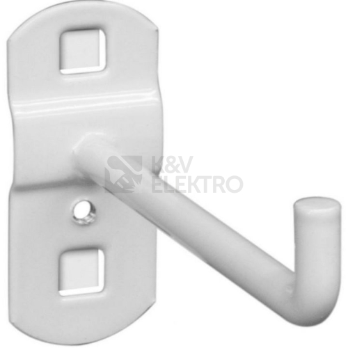 Hák s pravoúhlým zakončením, kompatibilní s dílenskými závěsnými systémy, které využívají čtvercové děrování 10 mm2 při vertikální/horizontální vzdálenosti středů otvorů 38 mm. Délka závěsné plochy: 90 mm. Typ balení: volné (kusové).