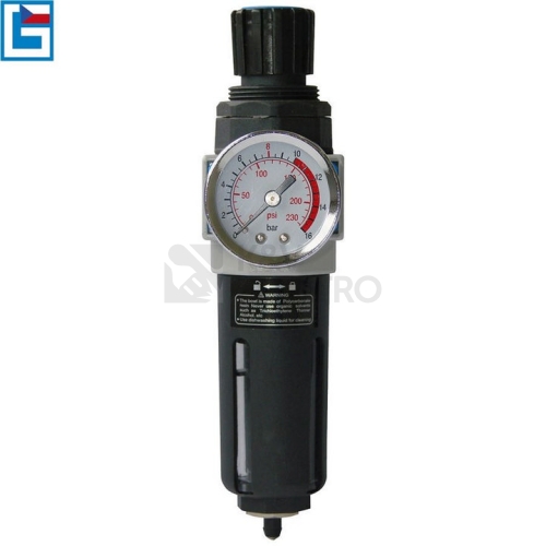 Úpravná jednotka, určená k separaci kapalných částí/hrubých nečistot ze stlačeného vzduchu (-> odlučovač vody s filtrační vložkou) a regulaci výstupního tlaku (-> redukční ventil). Konstrukce: manometr 0-10 bar, otočná hlavice (-> aretace pracovního tlaku), filtrační vložka, nádobka pro zachycování kondenzátu, výpustný ventil (-> manuální odpouštění kondenzátu).