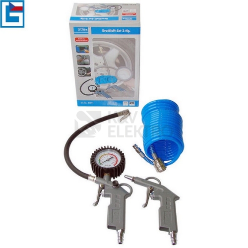 3-dílná sada pneu nářadí/příslušenství, určená k běžnému použití v prostředí garáží, domácích dílen, chalup apod. (-> plnění pneumatik/ofukování stlačeným vzduchem). Složení sady: hustilka pneumatik, ofukovací pistole, spirálová hadice. Konstrukce: korpus pistole/hustilky z tlakově litého hliníku, manometr pr. 60 mm s gumovou ochranou, ventilová zástrčka Michelin, 5 m spirálová hadice z polyuretanu včetně vsuvky/rychlospojky. Příslušenství: vsuvka 1/4'' (3), rychlospojka (1). Technické parametry viz 02814/02819/41400.