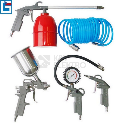 4-dílná sada pneu nářadí/příslušenství, určená k běžnému použití v prostředí garáží, domácích dílen, chalup apod. (-> nanášení barev-laků/plnění pneumatik/ofukování stlačeným vzduchem). Složení sady: stříkací pistole s vrchní nádobkou, hustilka pneumatik, ofukovací pistole, spirálová hadice. Konstrukce: pistole/hustilka z tlakově litého hliníku, manometr pr. 60 mm s gumovou ochranou, ventilová zástrčka Michelin, 5 m spirálová hadice z polyuretanu včetně vsuvky/rychlospojky. Příslušenství: vsuvka 1/4'' (4), rychlospojka (1). Technické parametry viz 02814/02818/02819/41400.