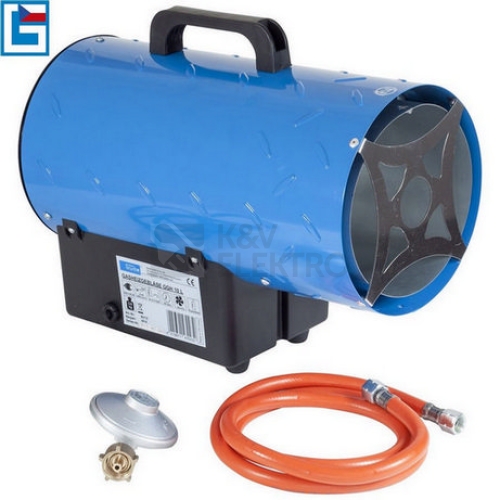Kompaktní plynová turbína, určená k rozmrazování, temperování nebo vysoušení odvětraných prostor v nebytových objektech (-> sklady, haly, garáže, staveniště apod.). Horkovzdušný ventilátor (-> průtok vzduchu: 580 m3/hod.), piezoelektrické zapalování, provoz na propan/butan (-> I3 B/P, průměrná spotřeba: 0,73 kg/hod.). Konstrukce: plášť turbíny z oceli, hořák z ušlechtilé oceli, stojný podstavec s ovládacími prvky, 1,2 m přípojný elektrický kabel, transportní rukojeť. Příslušenství: 1,5 m plynová hadice, redukční ventil. Celkové rozměry (d x š x v): 370 x 185 x 300 mm, topný výkon: 8.600 kcal/hod.