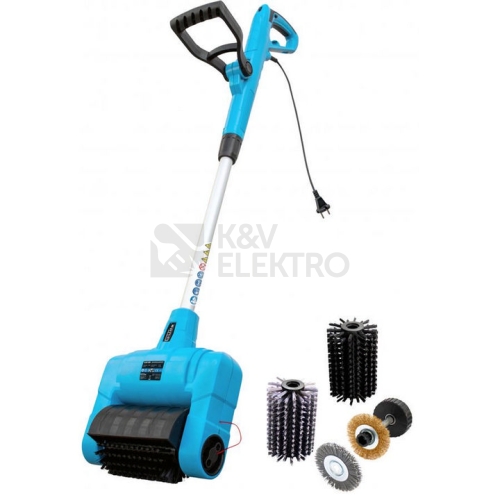 Kartáčový čistič, určený k údržbě pochozích (jiných nezastřešených) pevných ploch v sousedství domu. Důkladné očištění povrchu dlažebních kostek, keramických (betonových) dlaždic, terasových prken ap. od mechů a řas • odstranění usazenin nebo plevele z úzkých spár. 6stupňové nastavení otáček (600 - 1.300 min-1) • kartáčové válce pro precizní (rovnoměrné) vyčištění menších ploch • štěrbinové kartáče (drátěný a nylonový) vč. opěrného kolečka. Motor 500 W/P1, dvoubodový bezpečnostní spínač, 0,35 m síťový kabel H05 VV-F. Konstrukce: teleskopická* násada, polohovatelná přídavná rukojeť, ochranný kryt. Celkové rozměry (d x š x v): 280 x 145 x 1.010 mm, *max. délka vysunutí: 300 mm, hladina akustického výkonu LWA: 96 dB (A), třída ochrany: II, stupeň krytí: IP X0. Příslušenství: • 1 x široký nylonový kartáč, tvrdý • 1 x široký nylonový kartáč, měkký • 1 x kovový kartáč z nerezového materiálu, úzký • 1 x nylonový kartáč, úzký