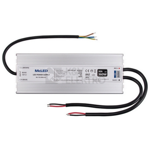LED napěťový zdroj pro LED pásky 360W, krytí IP67, výstup 12VDC, 30A. Vstup: 170-250VAC, 47-63Hz, materiál krytu: hliník. Rozměry: 260x90x40mm, hmotnost: 1520g. Zdroj SELV. Zdroj má 2 výstupy, každý lze zatížit max. 15A. Při výběru zdroje počítejte s výkonovou rezervou min. 20%.