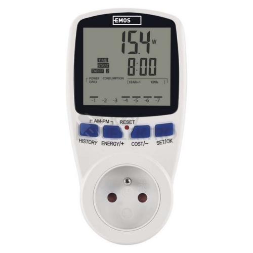 Pokud chcete mít přehled o spotřebě elektrické energie, vyzkoušejte tento praktický měřič spotřeby a odhalte největší žrouty energie u vás doma! Chcete znát přesnou spotřebu elektrické energie vašich spotřebičů, a mít tak své výdaje pod kontrolou? Nový měřič spotřeby P5805, vycházející z modelu P5801, vám s tím pomůže. Jediné, co musíte udělat, je zapojit ho do zásuvky a poté přímo do wattmetru připojit zařízení, jehož spotřebu chcete měřit. Pomáhá snižovat náklady na elektrickou energii a zároveň snižovat emise CO2 Měřič spotřeby energie P5805 umí spolehlivě změřit napětí, proud, frekvenci i okamžitý odebíraný výkon. Můžete si na něm také nastavit ceny elektřiny a hodnoty emisí CO2 a zobrazit si náklady na provoz spotřebiče pomocí grafu v rozmezí 7 dnů, 7 týdnů nebo 7 měsíců. Produktové číslo 1911000050 max. zátěž 3 680 W napětí/proud 230 V~/16 A max. rozsah měření 2 W–3 680 W dětské clonky: ano rozměr 148 x 75 x 75 mm LED indikace přetížení ano max. zaznamenaný čas 9 999 hodin záložní akumulátor 2x 1,5 V (LR44/AG13 - součást výrobku) rozsah spotřeby elektrické energie 0 kWh–9 999 kWh