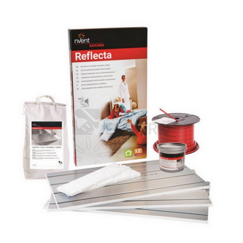 Balení samoregulačního podlahového vytápění nVent RAYCHEM T2Red a Reflecta na plochu 10 m² je kompletní souprava kabelů T2Red, desek Reflecta a příslušenství pro instalaci 10 m² laminátové nebo dlaždicové podlahy.