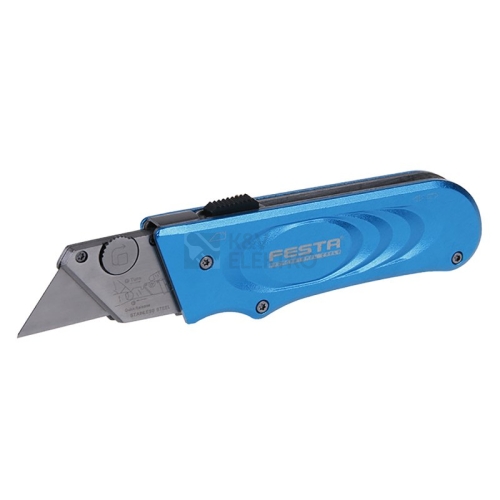 Profesionální celokovový nůž, výsuvná lichoběžníková čepel s aretačním tlačítkem, klip na opasek, 5 náhradních čepelí.