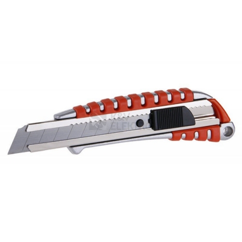 Odlamovací nůž FESTA 18mm, kvalitní materiály, celokovové tělo nože, protiskluzné plastové výstupky, kovová lišta, automatická posuvná aretace, do nože lze umístit až 2 náhradní břity, blistr.