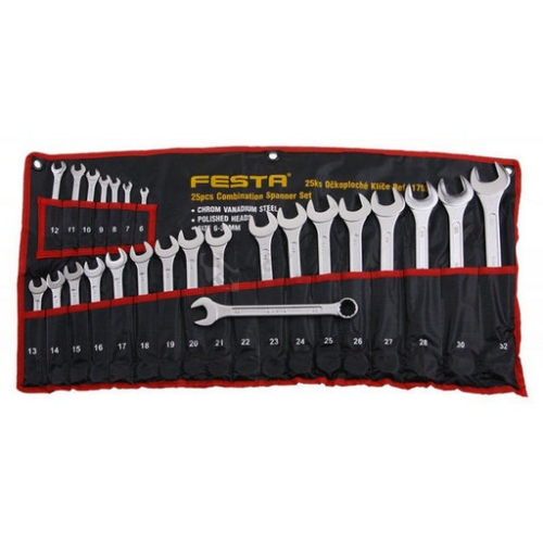 Sada očkoplochých klíčů FESTA je včetně organizéru, sešitého z velmi odolné a pevné tkaniny s oky pro zavěšení. Nástrčné očkoploché klíče jsou vyrobeny kováním z kvalitní chromvanadiové oceli. Tato ocel je zušlechtěná na požadované vlastnosti a povrchově upravená matným tvrdochromem pro dosažení optimální povrchové tvrdosti a odolnosti vůči korozivním vlivům. Kvalitou, tvrdostí a přesností přesně odpovídají normě DIN3113.