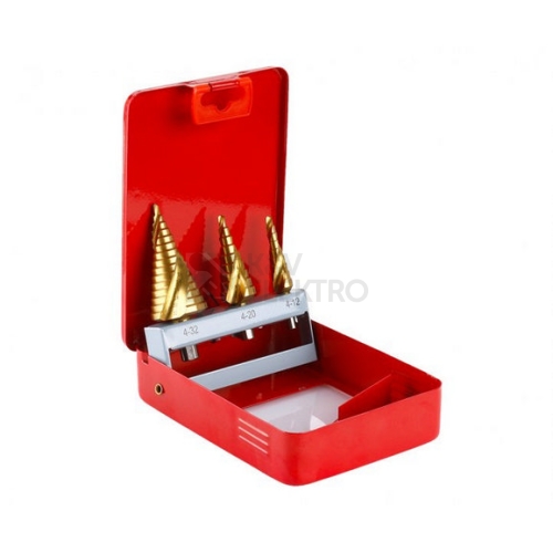 sada stupňovitých vrták z kvalitní HSS oceli DIN 1412C s TiN vrstvou vrstva TiN zvyšuje odolnost a životnost vrtáku pro vrtání slitin a ocelových plátů do tloušťky 4 mm, plastu a dřeva, široké drážky snadno odvedou odvrtaný materiál 4 - 12 / 4 - 20 a 4 - 32 mm, průměry jsou označeny na vrtáku Instruktážní video