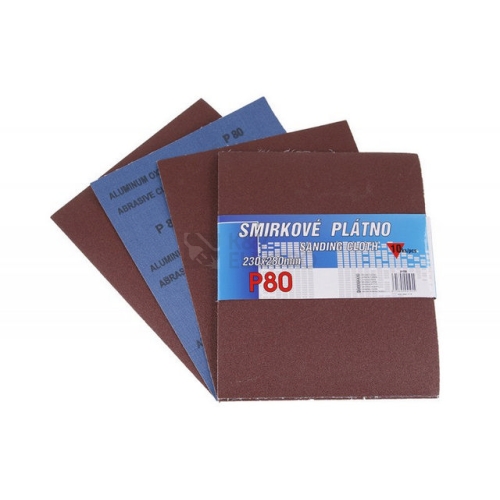 Smirkové plátno - sada 10 kusů, zrnitost: 80, druh zrna: oxid hlinitý, pojivo: syntetická pryskyřice, podkladový materiál : pružná tkanina-100% bavlna (240-260g/m2), rozměry : uvedeny v názvu výrobku, balení : 10 kusů - papírový návlek.
