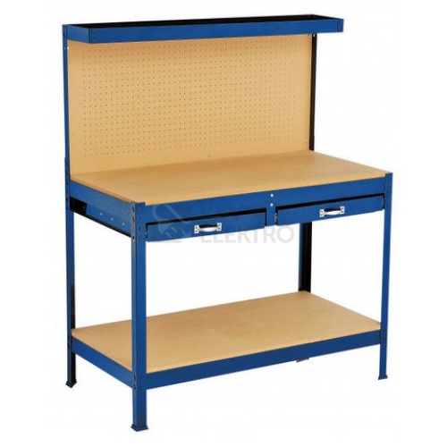 kvalitní kovový pracovní stůl - vhodný do malých dílen, garáží, sklepů konstrukce rámu z kovového plechu s práškovým lakem proti korozi dvě praktické zásuvky s vodícími lištami lehký chod výsuvu sololitová odolná pracovní deska i spodní odkládací deska zadní stěna s otvory pro upevnění háčků a zavěšení nářadí s praktickou horní odkládací plochou rozměry: výška celková 150 cm výška pracovní desky 90 cm výška dolní odkládací plochy 50 cm šířka 121 cm hloubka 61 cm