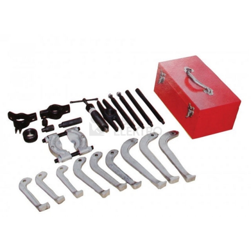 Pohodlná práce díky využití hydrauliky, která snižuje vynaložení síly pro utažení šroubu. Obsahuje plné čelisti, 3 trojice ramen různých délek a rozpětí, 2 hlavy umožňují volit mezi 2 a 3 bodovým upnutím, hydraulický šroub, baleno v kovovém kufru.