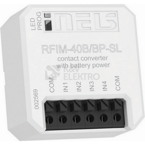 • RFIM-40B/BP-SL: bezdrátový převodník kontaktu změní drátové tlačítko/vypínač na bezdrátový.- 4 vstupy umožňují ovládat nezávisle na sobě 4 prvky,- bateriové napájení (3 V baterie CR123A - součástí balení) s životností cca 8 let dle četnosti užívání,- kontakt může být trvale sepnutý.• Lze jej využít k přenosu informace o sepnutí kontaktu (detektoru, tlačítka, technologie, logického výstupu).• Po stisku tlačítka vysílá nastavený povel (ON/OFF, stmívání, časové vypnutí/zapnutí, vytažení/zatažení).• Možnost nastavení scén, kdy jedním stiskem ovládáte více prvků iNELS RF Control.• Dosah až 200 m (na volném prostranství), v případě nedostatečného signálu mezi ovladačem a prvkem použijte opakovač signálu RFRP-20 nebo prvky s protokolem RFIO2, které tuto funkci podporují.• Komunikační frekvence s obousměrným protokolem RFIO2.• Provedení BOX nabízí montáž přímo do instalační krabice pod tlačítko/vypínač.