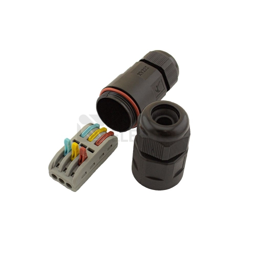 Kabelová vodotěsná spojka bezšroubová pro vícežilové kabely s krytím IP68. Vhodná pro venkovní použití, např. pro připojení reflektorů. Doplňkové parametry: Počet kontaktů: 3 Max. průměr kabelu: 6.5mm ,9mm ,12mm Průřez vodičů: 0,5-2,5 mm2 (21 AWG) Test hořlavosti: UL94-VO Krytí: IP68 do 1 metru hloubky, poté IP67 Materiál: Polyamid PA 6,6 Těsnění: silikon Kontakty: mosaz Typ svorkovnice jako WAGO 221