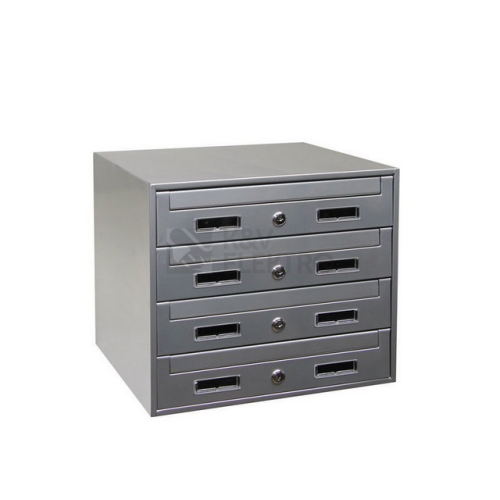 Hotová sestava ocelových schránekMožnost tvorby variabilních sestavFunkce - vhoz i výběr vpředuRozměr jednotlivé schránky š/v/h: 400×85×300 mm, Rozměr sestavy š/v/h: 400 x 350 x 300 mm, Rozměr vhozu š/v: 340 x 24 mm, Počet schránek v sestavě: 4Síla materiálu: tělo 0,65 mm, , dvířka 0,85 mm, Hmotnost netto: 6,7 kgBalení vč. 2 ks klíčů / schránkaBarva: stříbrná - S (flash silver)