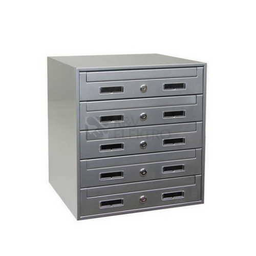 Hotová sestava ocelových schránekMožnost tvorby variabilních sestavFunkce - vhoz i výběr vpředuRozměr jednotlivé schránky š/v/h: 400×85×300 mm, Rozměr sestavy š/v/h: 400 x 450 x 300 mm, Rozměr vhozu š/v: 340 x 24 mm, Počet schránek v sestavě: 5Síla materiálu: tělo 0,65 mm, , dvířka 0,85 mm, Hmotnost netto: 7,9 kgBalení vč. 2 ks klíčů / schránkaBarva: stříbrná - S (flash silver)