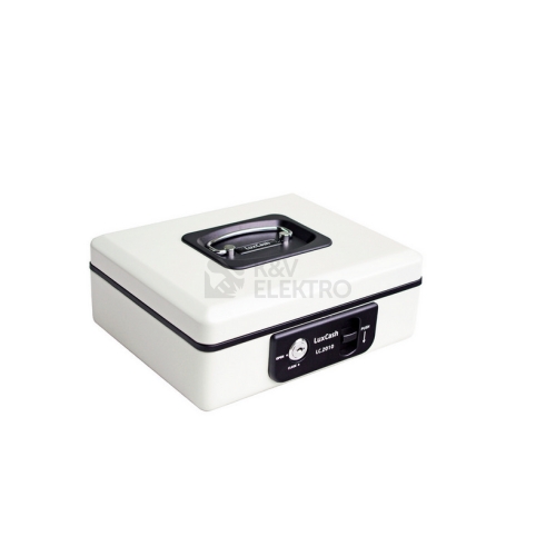 Ocelová pokladnička s páčkou pro pohodlné otevření víka a blokací proti jeho samovolnému zavřeníRozměr vnější š/v/h: 230 x 85 x 190 mm, Povrch: práškový epoxidHmotnost netto: 1,32 kgBalení vč. vaničky na mince, filce a 2 ks klíčůBarva: bílá