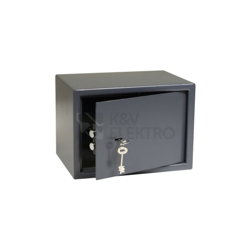 Ocelový sejf s mechanickým zámkemRozměr vnější š/v/h: 350 x 250 x 250 mm, Rozměr vnitřní š/v/h: 346 x 246 x 190 mm, Objem: 16 lHmotnost netto: 9,0 kgSíla materiálu: dveře 4 mm, , plášť 2 mm, Možnost ukotvení do zdi nebo podlahy.Balení vč. ocelových hmoždinek, 1 ks police, vnitřní plstě, šroubů a 2 ks klíčů.Barva: šedá (RAL7016)