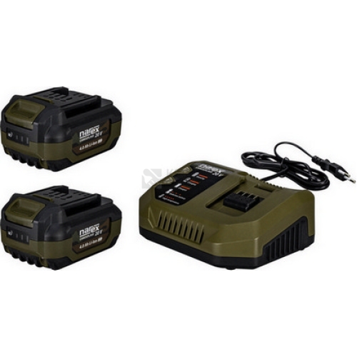 Pro stroje a svítilnu řady CAMOUFLAGE, Dva akumulátory a nabíječka by měly tvořit základní příslušenství každého výkonnějšího nářadí. Zatímco s jedním akumulátorem se pracuje, druhý se nabíjí., Startovací set Camouflage obsahuje dva výkonné 4Ah akumulátory a rychlou nabíječku. Nabízí se za zvýhodněnou cenu., Akumulátory i nabíječku lze zakoupit také samostatně., START SET-CMFL, START SET-CMFL, START SET-CMFL, START SET-CMFL