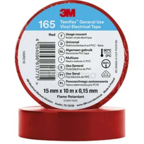 Elektrikářská izolační páska Temflex165 má tloušťku 0,15 mm a jde o PVC izolační pásku pro všeobecné použití. 3M izolačka Temflex 165 Vinylová elektrotechnická páska je určena pro základní izolaci pro všechny nízkonapěťové vodiče a kabelové spoje a také na opravy a svazkování vodičů a kabelů. Tato profesionální páska má vylepšenou funkčnost a je vhodná pro vnitřní i venkovní použití. Páska je vhodná ke stahování vodičů a má dobrou odolnost vůči oděru, kyselinám, zásadám a proměnlivým povětrnostním podmínkám, včetně slunečního svitu. Zachovává si vysokou úroveň výkonu při teplotě okolního prostředí až 90 °C. Páska je k dispozici ve standardních barvách. Dobrá odolnost vůči prodření, vlhkosti, zásadám, kyselinám a různým povětrnostním vlivům (včetně slunečního světla). Je dostupná ve standardních průmyslových barvách Vysoká elektrická odolnost Profesionální páska vhodná pro vnitřní i venkovní použití K dispozici ve standardních barvách IEC 60454-3-1-5/F-PVCP/90
