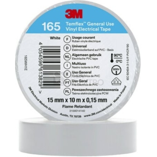 Elektrikářská izolační páska Temflex165 má tloušťku 0,15 mm a jde o PVC izolační pásku pro všeobecné použití. 3M izolačka Temflex 165 Vinylová elektrotechnická páska je určena pro základní izolaci pro všechny nízkonapěťové vodiče a kabelové spoje a také na opravy a svazkování vodičů a kabelů. Tato profesionální páska má vylepšenou funkčnost a je vhodná pro vnitřní i venkovní použití. Páska je vhodná ke stahování vodičů a má dobrou odolnost vůči oděru, kyselinám, zásadám a proměnlivým povětrnostním podmínkám, včetně slunečního svitu. Zachovává si vysokou úroveň výkonu při teplotě okolního prostředí až 90 °C. Páska je k dispozici ve standardních barvách. Dobrá odolnost vůči prodření, vlhkosti, zásadám, kyselinám a různým povětrnostním vlivům (včetně slunečního světla). Je dostupná ve standardních průmyslových barvách Vysoká elektrická odolnost Profesionální páska vhodná pro vnitřní i venkovní použití K dispozici ve standardních barvách IEC 60454-3-1-5/F-PVCP/90